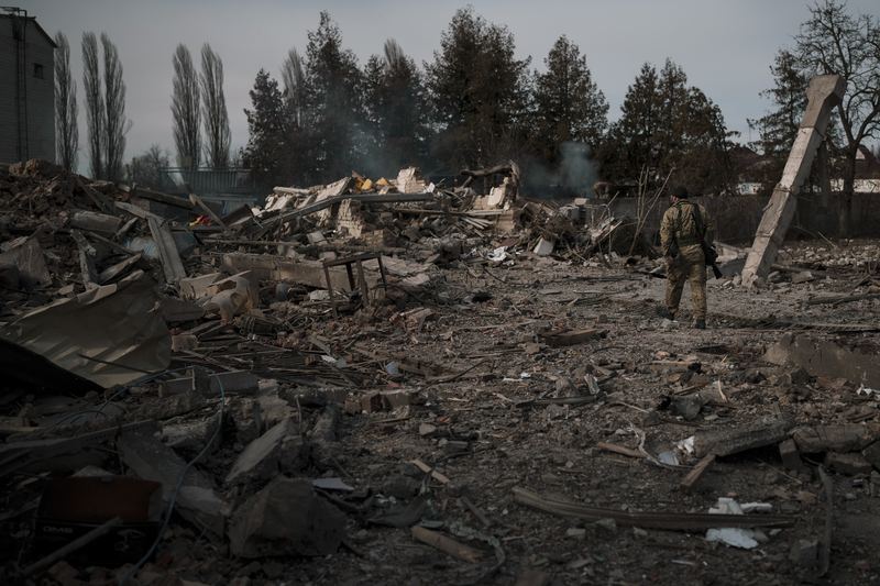 A member of the Ukrainian Territorial Defense Forces surveys wreckage near Kyiv, Ukraine.