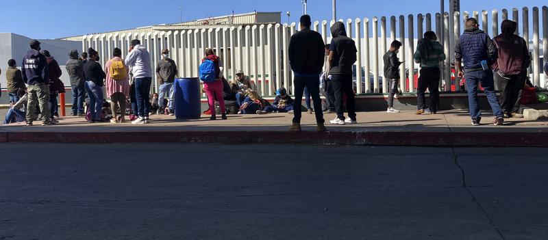 Migrants waiting to cross into the United States wait for news at the border crossing Wednesday, Feb. 17, 2021, in Tijuana, Mexico.