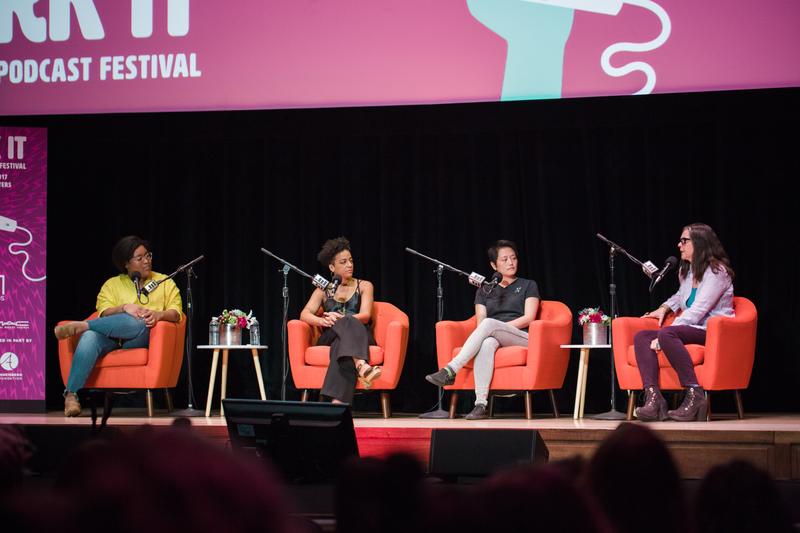 (L to R) Call Your Girlfriend's Aminatou Sow, WNYC's Rebecca Carroll, Nancy's Kathy Tu, and Ear Hustle's Nigel Poor speaking at the 2017 Werk It Festival.