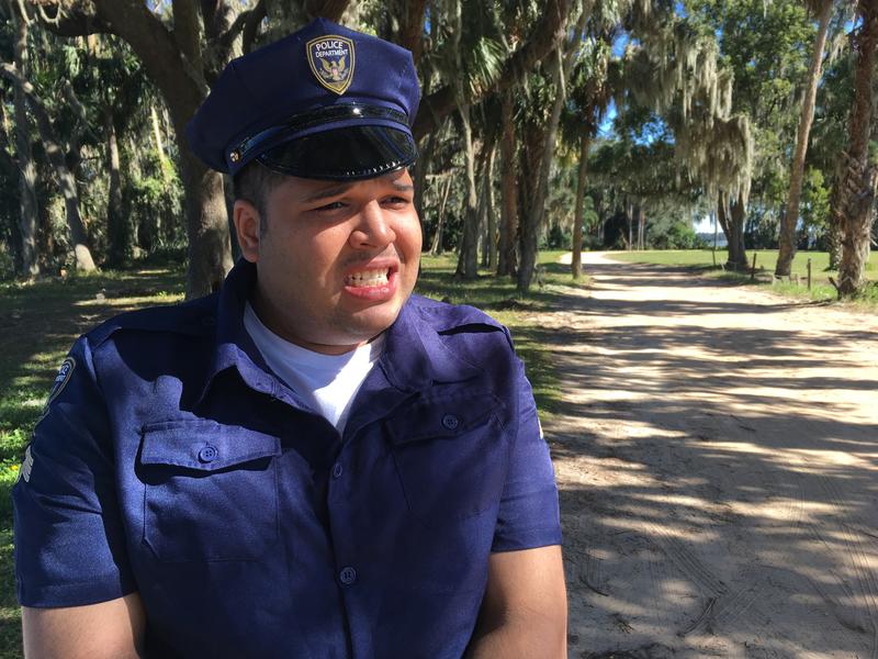 We meet Arnaldo at a strip mall pizza joint. He sits there with seven other men, clients, and four Carlton Palms workers. And like the men I’d seen earlier, Arnaldo’s also dressed in a dark blue police uniform. Plastic handcuffs and all. It feels like some kind of twisted joke, a really sick one. Here he is, probably the autistic person most famous for a bad police encounter, and they’ve dressed him up like a cop.