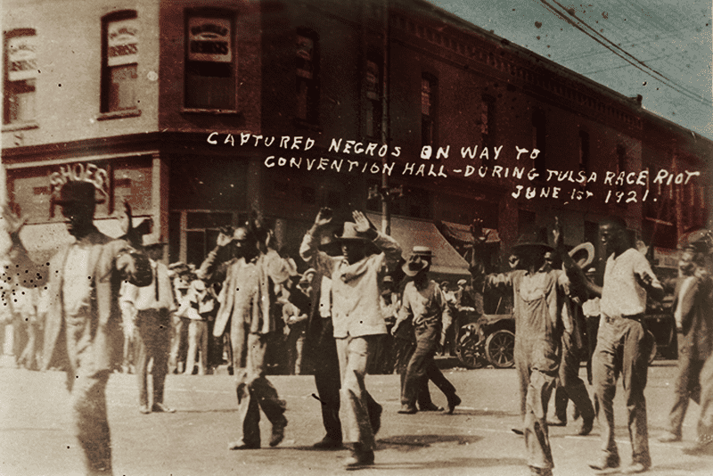 And written by hand across the top of the image, it reads: “Captured Negroes on the way to convention hall during Tulsa race riot, June 1st, 1921.”