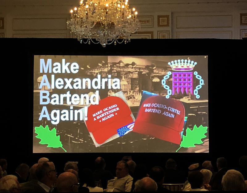ARONCZYK: Well, at lunch,everyone gathers in the Presidential ballroom under the chandeliers. And there’s a screen up behind the podium with the image of two red MAGA hats. But instead of “Make America Great Again” these hats read: “Make Ocasio-Cortez Bartend Again.” (AMBI)
