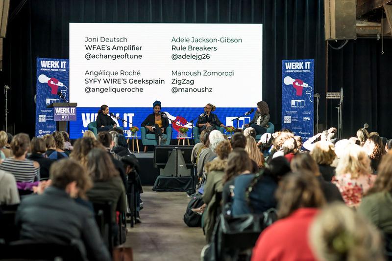 We have Adele Jackson-Gibson right there in the center. She's a Brooklyn-based writer, model, and actor passionate about sports so passionate in fact that she has co-host the Rule Breakers podcast where she interviews women making moves in the sports industry. Angelique Roche is right to my right. She is a graduate of George Washington University law school, been working in law and politics for a number of years. But rather than give you a very clean view of the law very good maybe boring side of it, she hosts podcasts like Geeksplain and Marvel’s Voices to show the intersection of pop culture, current events, and social justice. She is such a nerd really great to have her. And I say that because I am also a nerd. And for many that are fans of WNYC programming you may know of the voice and face of Manoush Zomorodi. She created and hosted the podcast Note to Self. Recently launched the amazing media company Stable Genius Productions and its first project which she hosts called Zigzag, which plots the changing course of cryptocurrency, the block chain, and women's lives. So thank you all so much for being here today. I guess to get started you know you all are in different fields and I'm wondering why did you choose podcasting to branch out in those genres and I want to start with Adele.